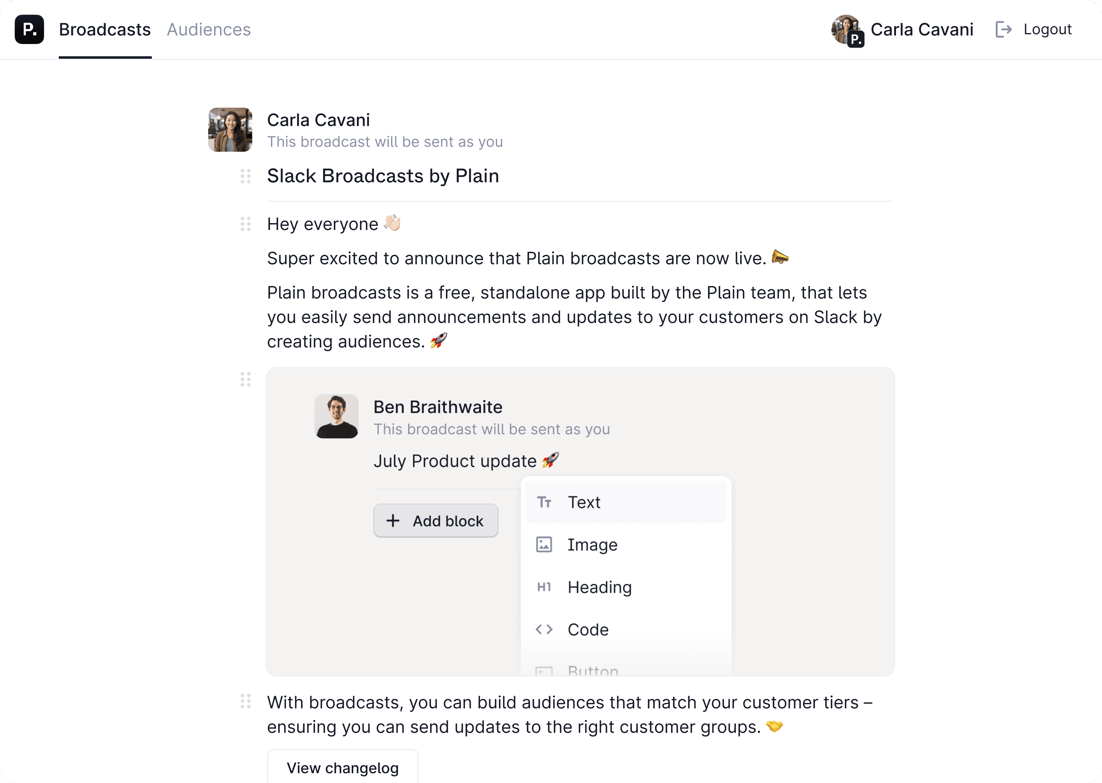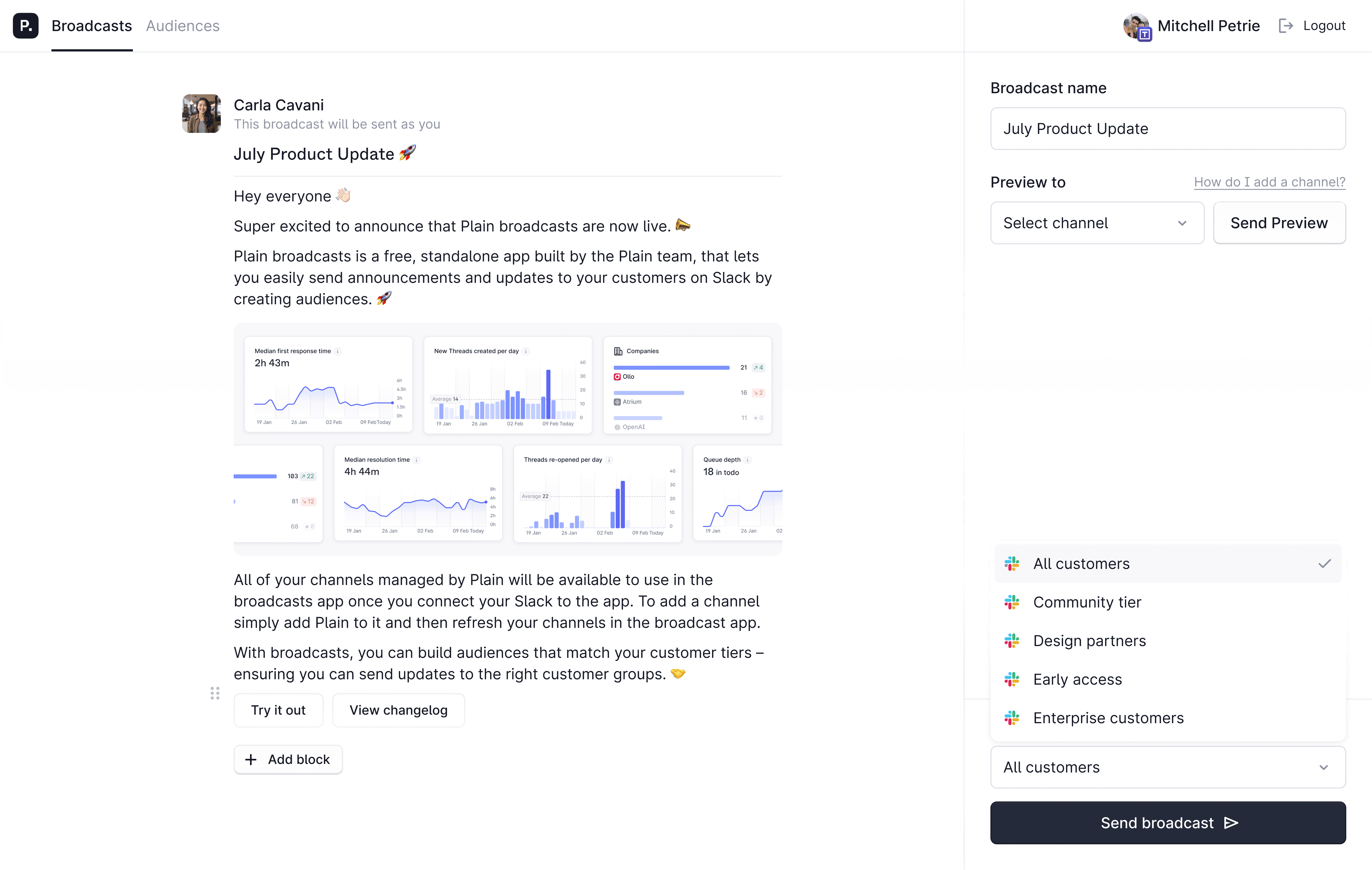 Connect your company Slack to Plain broadcasts and never miss an opportunity to share your wins with your customers again. A free, standalone app, brought to you by Plain.