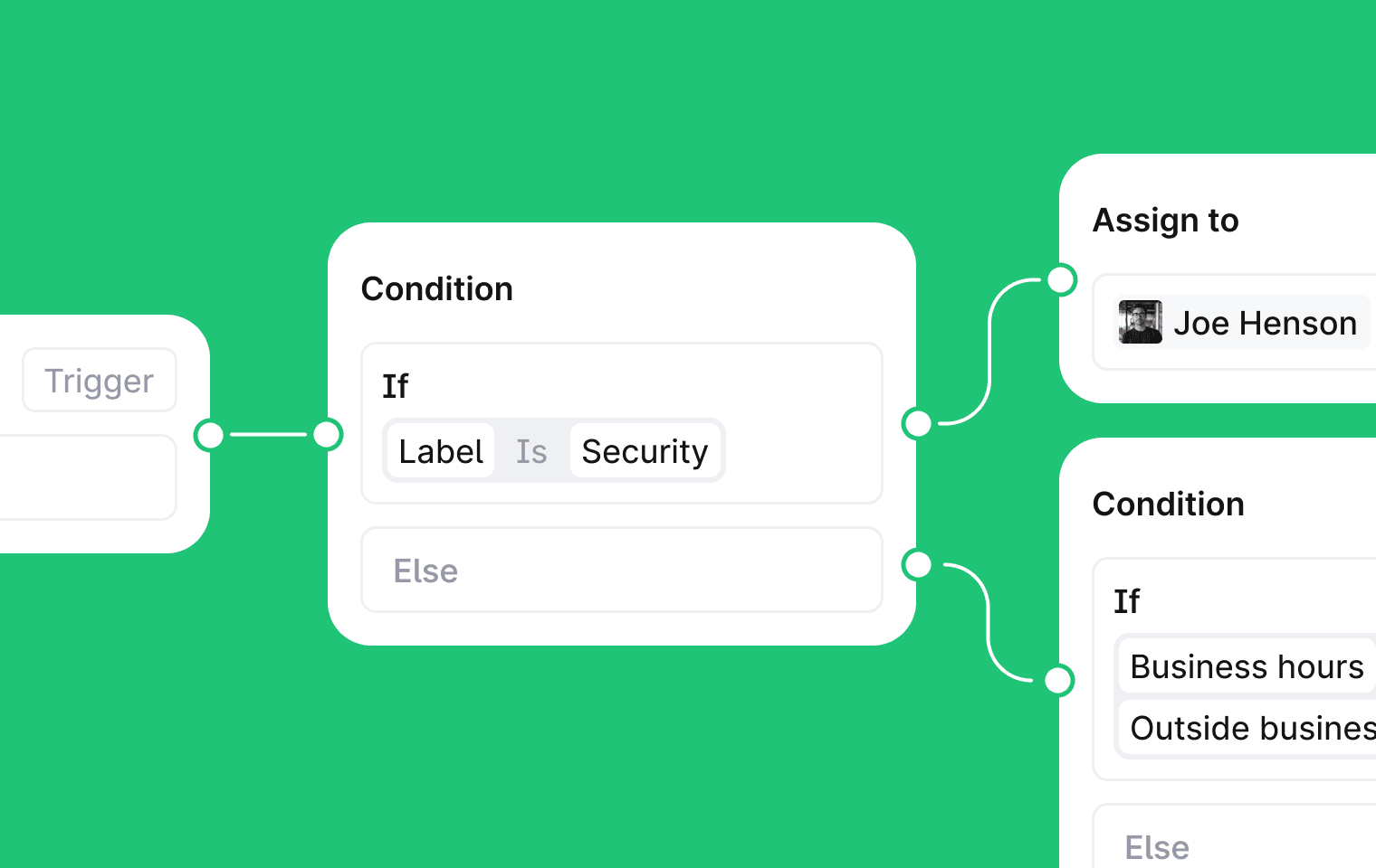Pick a trigger (manual, or automatic on events like thread created, message added, or status changed). Add conditions that branch based on thread properties, customer data, channel, AI evaluation, or custom fields. Then chain actions together: assign threads, set priority, send messages, apply labels, add notes, or fire HTTP requests to external services.