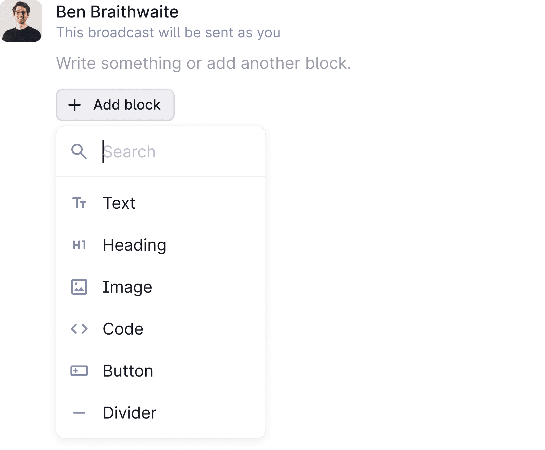 Text, Titles, Images, Code, Lists, Dividers and Buttons. All the blocks you need for a great broadcast.